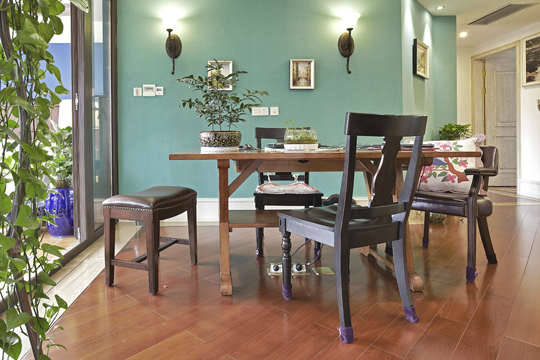 编辑点评:木板搭配木质餐桌,和谐又富有质感。盆栽生机勃勃,与蓝绿色壁纸搭配更为活力四射。落地窗则采光极好,通风性强。整体营造悠闲舒适的自然风味。