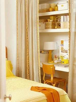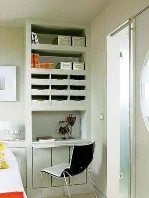 何谓书房?可以是单独的一间屋子,也可以是简单的一张桌一把椅,就看你是如何定义的了。卧室中总会有些闲着的角落空间,无论是床头还是床尾或者是靠墙的位置,都可以挪挪然后设计成小小的书房空间。