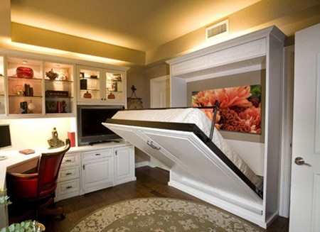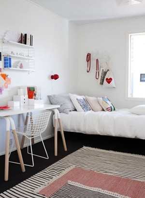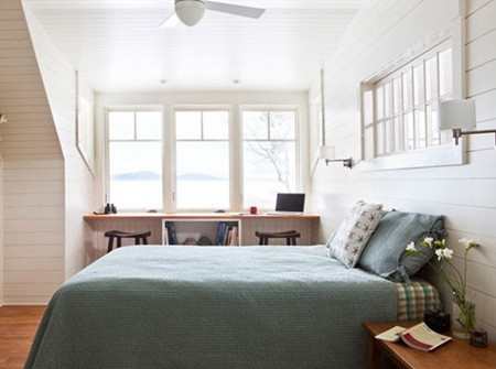 将放置床头柜的地方腾出来安排一个工作台,能工作还能放东西,也挺实用。对于卧室空间够大的人家来说,放上几个夸张的床头柜、衣橱之类的无可厚非,但是如果是小户型也如此奢侈就有点过了,所以将床沿墙摆放,在空出来的地方放上工作用的书桌椅,在墙面上设计几个实用的搁架,就能同时节省下书房和卧室的空间。