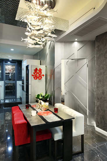 【太平洋家居网 设计频道】温馨浪漫风格的婚房设计司空见惯,极易让人产生审美疲劳,但这间炫酷时尚的婚房一定会让你眼前一亮。设计师巧妙地利用墙面的红黑线条营造空间的动感和活力,门片设计光滑无棱角,自然地“隐藏”在背景墙中,层次感和立体感鲜明的吊顶设计也十分值得借鉴。