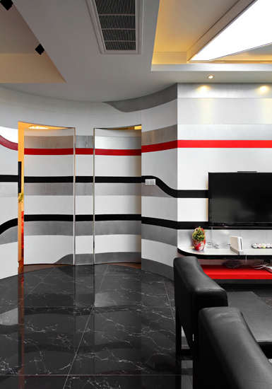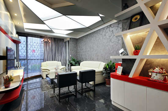 编辑点评:黑色和红色的Z型搁板组合成为电视柜,强烈的色彩对比营造出鲜明的层次感和动感,既美化了空间也活跃了氛围,延伸的线条感更拓宽了视觉空间。上方的银色弧形收纳区若隐若现,充满质感。