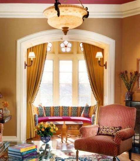将飘窗妆扮成舒适的沙发(沙发装修效果图),彩色的印花款式充满了异域的风情,与房间整体的橙色调相得益彰,搭配的十分的和谐,在两个壁灯与五瓣花朵图案的装饰下,就像西域国王的宝座。