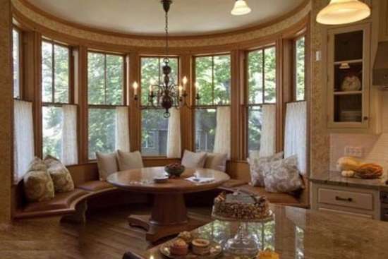 飘窗位于餐厅的一侧,格纹弧形窗体给餐厅带来大角度的美丽景致,飘窗的改造由软坐垫与靠包打造而成,成就极好的舒适角落,而在搭配上,窗帘的蓝色雨黄色花纹与靠包坐垫的相同搭配款,打造出无比自然的角落风情。