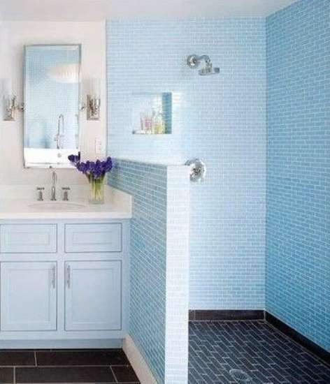 淋浴区全部采用相同尺寸的蓝色墙砖拼贴,工整中打破了白色卫浴间的单调。墙面上抠出一块四方形的小小的储物空间,将必需的沐浴用品搁置于此。