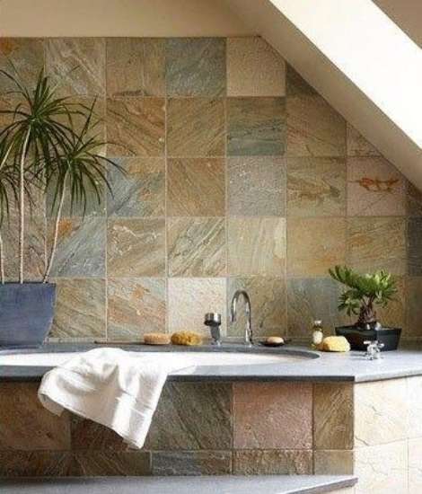 用最自然的大理石做墙砖,给卫浴间增添了自然、朴实感。几棵绿植加以点缀,令人感觉像回到了乡村,窗外是一望无际的蔚蓝天空和农家小院。