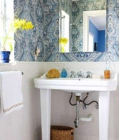 复杂图案的壁纸,将目光聚焦于此,给白色的卫浴间加点色彩,改变单调、冷清的格调。洗手池上的镜子,不仅可以增加空间感,还可以将室外的色彩反射进来,使整个空间更自然,更温暖。