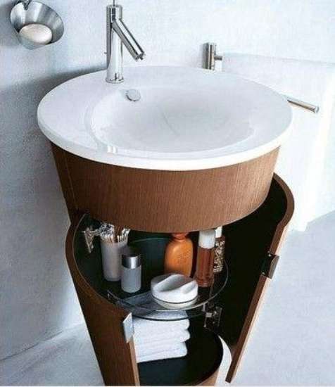 一般卫浴间的洗手池设计为台面盆的都可以充分利用洗手台下面的空间,因为这种设计完全可以在台盆下面的空间做收纳柜,用来收纳一些卫浴间必需品,如清洁剂、手套等工具。其他的抽屉可以用来收纳毛巾、浴巾、洗护用品等。