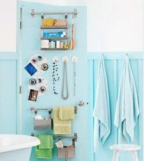将整扇门利用起来,用不锈钢的铁架来收纳小件的洗浴用品。利用承重性强,质量好的挂钩放在门后或是墙上,用来放置身上的饰物或者毛巾等,整体感觉很对称,又处处透露着个性。
