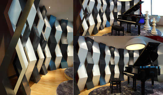 这面走廊背景墙的造型非常别致,采用光面的黑壳打造特殊的马赛克效果,带来奇异的现代感,而天花的灯饰创造了极好的视觉环境。相互交织的设计给走廊带来延伸的效果,空间因此而富于情调,更显宽敞大气。