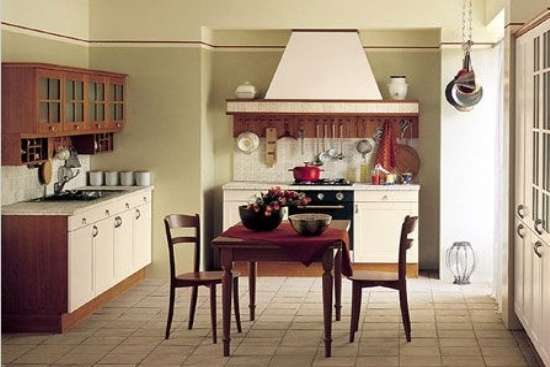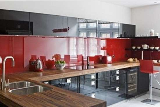 黑色与深沉的红色搭配起来时尚大气,而木纹清新的原木台面又让厨房多了一丝自然。