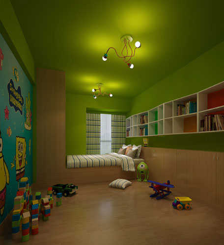编辑点评:小孩房就像娱乐城,卡通型吊灯、海绵宝宝的定制壁纸、超大的活动空间让空间拥有丛林和海洋的味道,十分适合小孩快乐童年的玩乐。