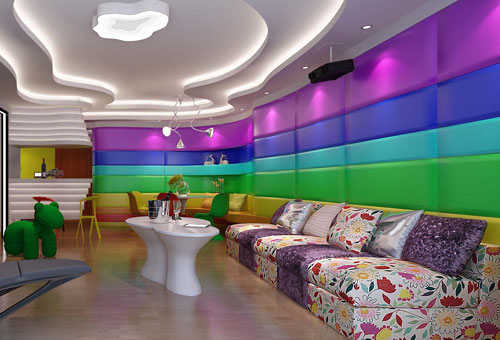编辑点评:客厅与餐厅一致,都用七彩虹人造革软包装饰墙体,让整体空间趋于和谐统一,更凸显彩虹海这一主题。活动性的组装沙发,灵活又图案丰富,靠墙而置,利于打造宽敞空间。
