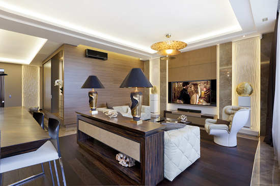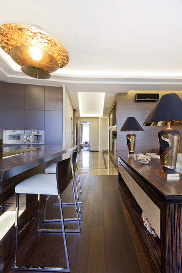 【太平洋家居网 设计频道】这间私人公寓既有中式风格的古典雅致,也有欧式风格的简洁舒适,精致细腻的墙面设计搭配低调奢华的灯饰摆设营造出优雅、大气的家居氛围,原木与大理石材质的完美融合更是大大提升了公寓的品质与格调。