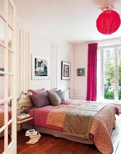 编辑点评:竖条相间的墙壁设计与窗帘相呼应,形成空间的整体对称美。同时通过线条来展现空间的立体感和线条美,红色窗帘和吊灯,被子相协和,整个卧室顿时显得温暖热烈,充满激情。