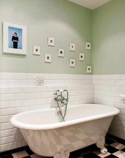 编辑点评:设计师采用黑白格子地板,白色格子瓷砖和凌乱格子相片墙设计,打造一个属于年轻人的个性浴室空间。同时硕大的浴缸柔化空间,刚柔并济,营造舒适放松的洗浴环境。
