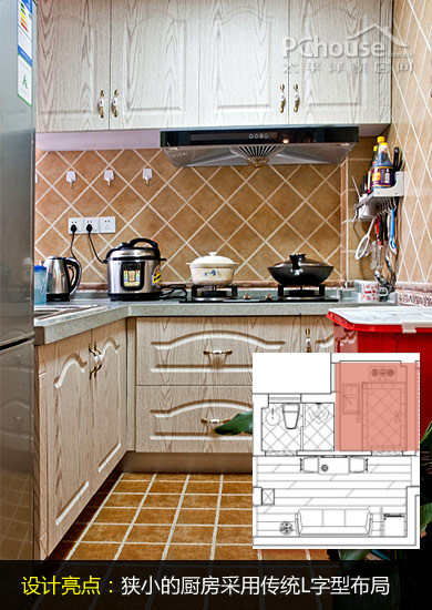 小编解析:厨房入口在电视背景墙右侧,呈现纵向狭长型,设计师按常规做法,打造成L字型厨房。通过吊柜与地柜的组合,实现更好的收纳功能。