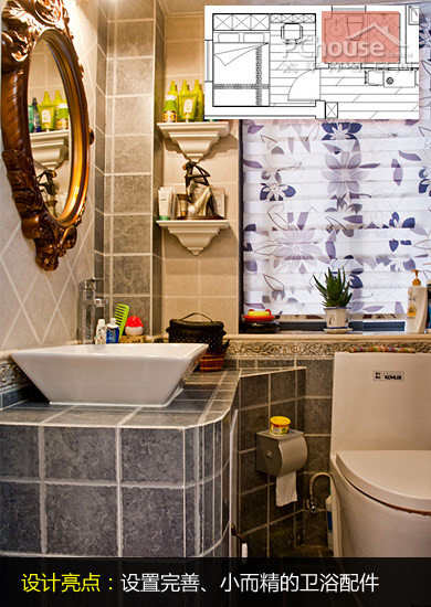 小编解析:业主没有购买浴室柜的意向,设计师用地中海风格磁砖拼贴出水泥柜,更实用易打理。墙角有欧式的小壁台,收纳各种瓶瓶罐罐;浴室镜边框稍显奢华,这些细节都丰富了浴室的华丽度。
