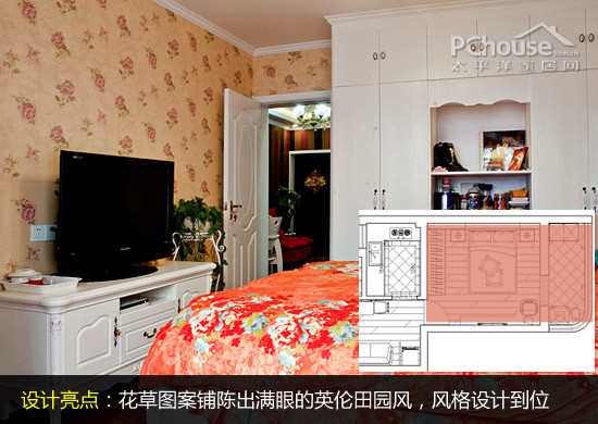 小编解析:主卧位于公共空间的右侧,开门走进,便能看见花草图案铺满墙纸与床被,满满的都是田园风格气息。
