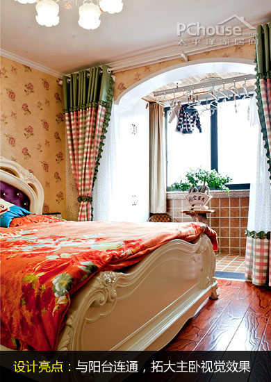 小编解析:主卧拥有整间房子的唯一一个阳台,打造拱门与阳台相连后,主卧空间视觉瞬间变大;把苏格兰格子布帘作软隔断,拉开就让卧室阳光满满,田园气息延续开去。