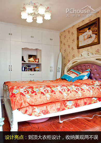 小编解析:主卧家具都以橡白色为主,波浪形的滚边线条是英伦风格的再现;另外,衣柜做顶处理,巨大的内部空间,足够收纳一家大小的衣物了。