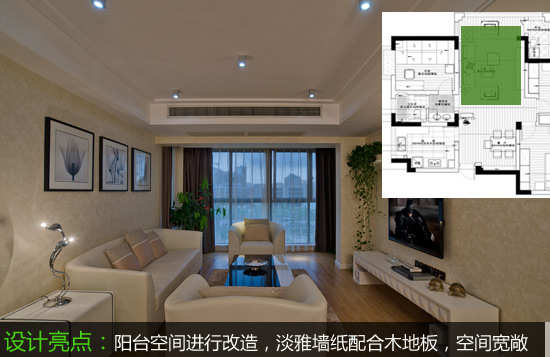 详细说明:客厅空间不足,通过把阳台改造,借用其空间,带来更大的纵深感,也有利于光线穿透;淡雅的墙纸配合木地板,立马营造出轻松简洁的居家环境!