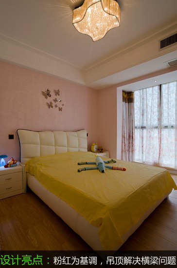 详细说明:客厅中横梁压顶造成不美观,设计师利采用错层吊顶的设计,能够很好地拔高整个家居空间,用挂画装饰单调的沙发背景墙,简约大方。