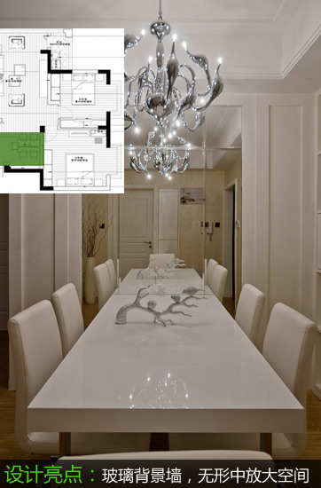 详细说明:餐厅玻璃背景墙在无形中增大空间,集实用性与观赏性与一体的形式。
