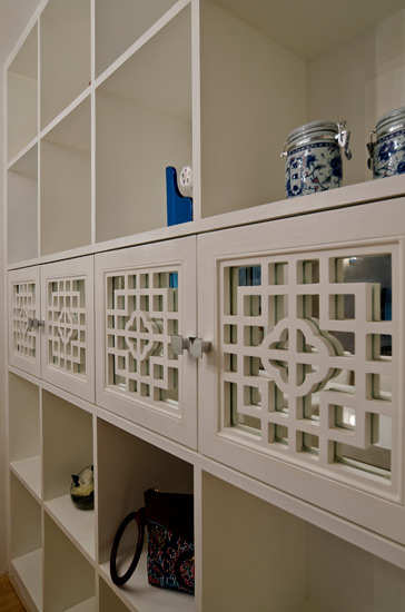 详细说明:玄关空间太小,以带有不同花格图案的透空木格栅屏作隔断,既有古朴雅致的风韵,又能产生通透与隐隔的互补作用。
