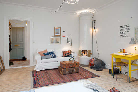 编辑点评:客厅采用开放式布局,仅靠复古风的地毯简单划出休息区,鲜艳的黄色桌子所在位置则成为了小小工作区;白色的布艺沙发融入背景,使视觉空间更显开阔。