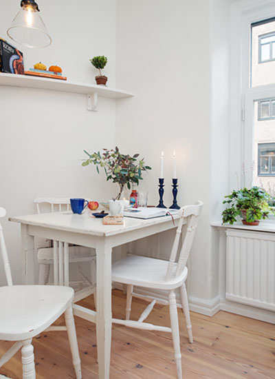 编辑点评:闲置的角落放上简约的木质餐桌椅成为餐厅,充分地利用了空间,白色的外观更使餐桌椅自然地融入背景,打造出雅致的北欧风餐厅。