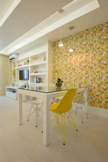 编辑点评:色彩缤纷的墙纸装饰餐厅背景墙,让餐厅区显得十分突出和亮眼,也有效地提升了空间的活力。