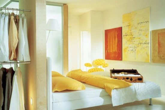 小户型的卧室应该尽量使用立面空间,如果需卧室里添加一些其他的功能区,可以充分利用墙面上的空间来进行扩容,例如将卧室和其他功能区的分割墙面打造成可以用来收纳的搁架,而这样半开放型的格局还有放大视觉感的作用。