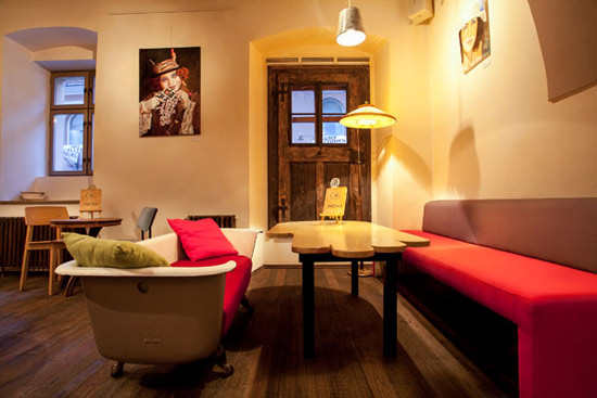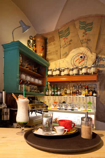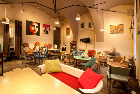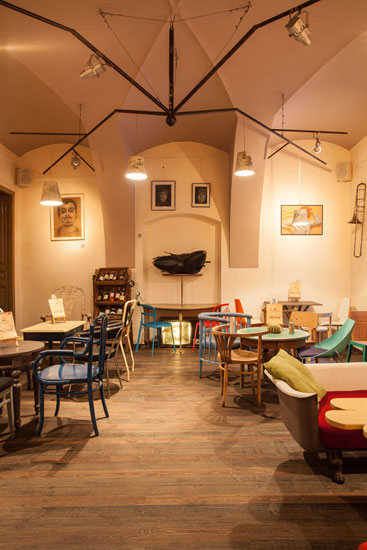 【太平洋家居网 设计频道】这家充满杂货风格,集合多设计元素于一身的咖啡厅位于罗马尼亚的布拉索夫,由设计师Manuel Teicu设计完成。Manuel Teicu同样是这家店的主人,咖啡厅位于一个拥有400年历史的古老建筑中,用充满活力与设计感的细节与装修风格为这栋老旧建筑注入了新鲜的活力。 这个温馨、舒适的咖啡厅中,能够同时容纳50人,其中比较吸引人眼球的是一个造型独特的沙发,类似于摄影棚内闪光灯造型的灯具也十分的独特。