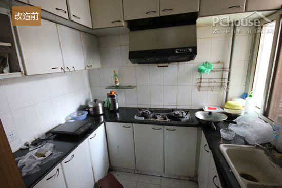 改造需求:整个空间显得厚重,上置的收纳柜带来压抑感;空间太小,只能容纳一人转身,毫无烹饪乐趣。