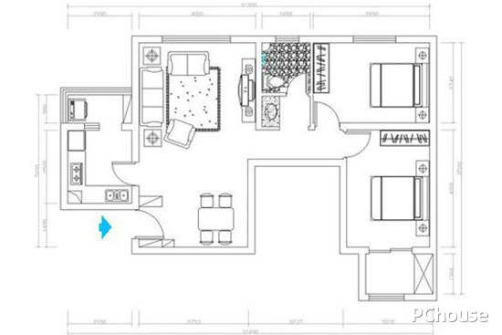 从这款户型图看来,这个二室一厅的布置是相当简洁的。从户型图看,采用了玄关设计,节省了空间。