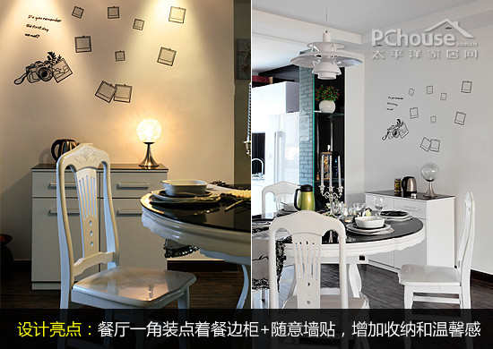 设计师解读:餐厅另一边,增设了一个小小餐边柜,射灯搭配随意的墙贴图案,温馨感扩散至整个居室,餐边柜的存在更增加了收纳。