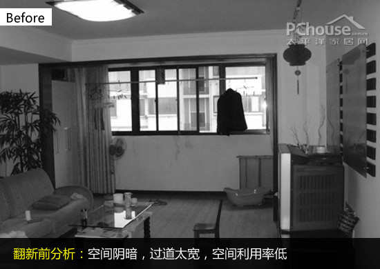 翻新前分析:依然是原木色调设计,空间略显阴暗,电视墙与沙发墙不够出彩,过道太宽,空间利用率不高。