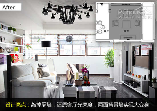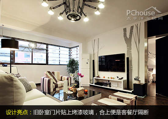 设计师解读:旧客厅的背景墙很呆板,毫无时尚动感可言。设计师把墙面刷白,并增加灰色的树干墙贴图案,一直延伸至餐厅,呼应了“爱的森林”主题,增加婚房的甜蜜之意。