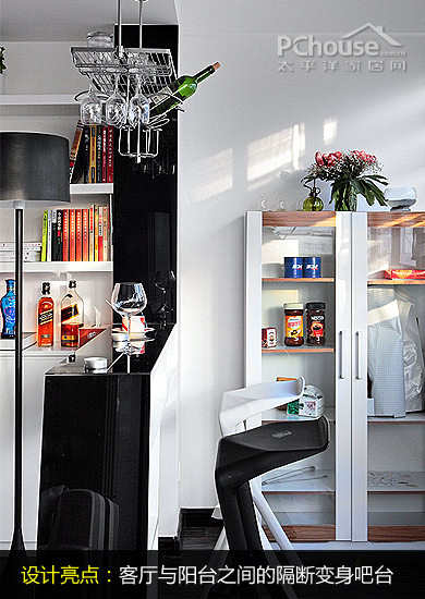 设计师解读:隔墙打掉后,上部用于采光,下部保留隔断,变身吧台,黑白吧椅搭配,呼应了居室的整体色调,也传递出都市人追求的夜色生活。一个收纳柜躲在角落处,既不影响美观,又增加收纳。