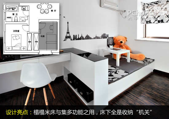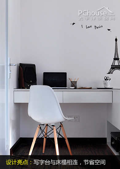 设计师解读:书房的写字台很简单,为了节省成本,设计师干脆把其打造成与床榻相连一体的结构,满足了使用需求,又不占用过多空间。
