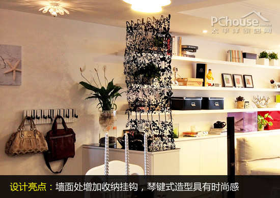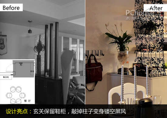 设计师解读:一是保留原有的玄关鞋柜,并刷成白色;二是敲掉碍眼的柱子,改以黑色镂空屏风;三是玄关天花处增加水晶灯,华丽度与亮度骤升。