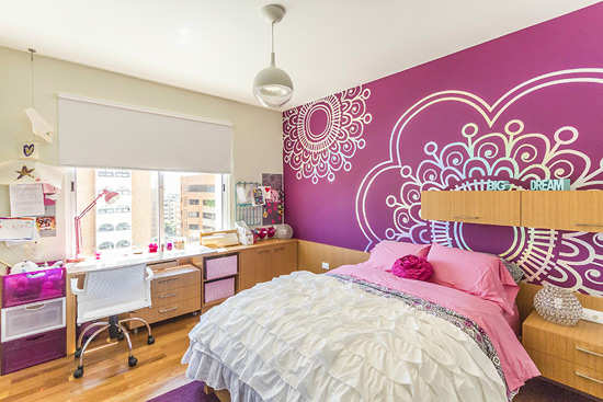 编辑点评:背景墙和被褥丰富的颜色大大地刺激了视觉感官,色彩的跳跃感和层次感有效地活跃了空间氛围,色彩控一定大爱这间卧室。