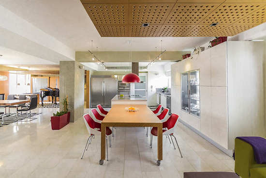 编辑点评:餐桌的桌脚位置安装了滑轮,让餐桌的移动更加轻松便利,也增强了空间的灵活性;餐椅的红色部分与吊灯相呼应,塑造了和谐的整体美感。