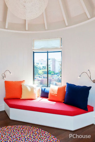 其实小窗户也能做成大飘窗的。像这样将飘窗台从窗户延伸至两边墙角,配上靓丽的红色飘窗垫就可以成为一道亮丽的风景线。