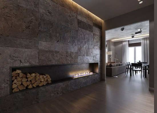 欧式不规则的大理石格子墙壁,浓烈地增加了整个空间的厚重感和庄严感,深浅搭配的灰色格子急速提高空间质感。下面凹进去的火炉巧妙与顶端的灯槽和谐一致了,另类地营造出温暖的空间氛围。整体极具艺术性的设计,展现高档、华丽、奢侈的生活品质。