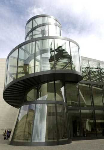 螺旋式楼梯的玻璃中心柱蜿蜒在三个楼层之间,看上去就像是一个透明的蜗牛壳。贝聿铭设计的楼梯塔是有些好奇,但是它应该是这样的:“它应该引诱人们在这个大楼里走动,充满好奇与享受。” 事实正是如此,每走一步就展开了明亮大厅的新景色,向外看,展现的又是柏林市中心的建筑。