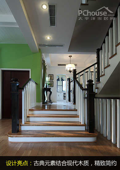 设计师解读:客厅通往餐厅,利用四级楼梯隔断。全屋的楼梯采用白格栅+褐扶手的色调搭配,这是传统英式风格的元素,结合现代材质与精致的工序,实现了简约的古典英伦风。