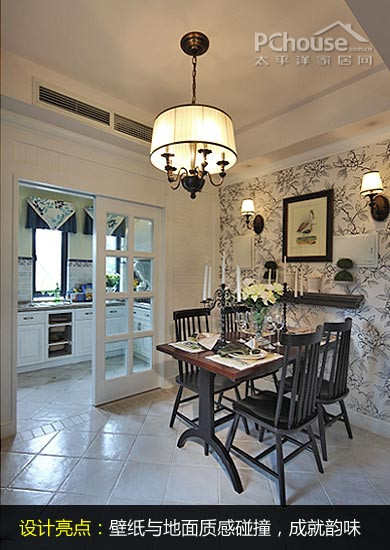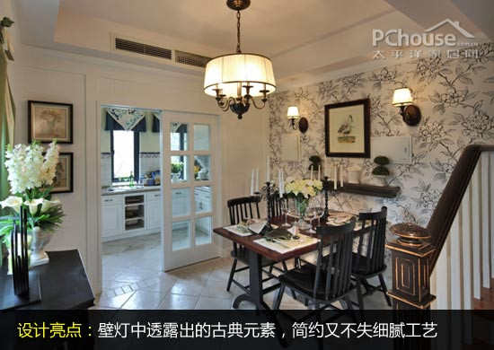 设计师解读:烛台+灯罩,传统的元素配合现代的灯光效果,营造出细腻的古典英伦风;深沉色调的餐桌餐椅,为简约空间增添丰富的视觉层次。