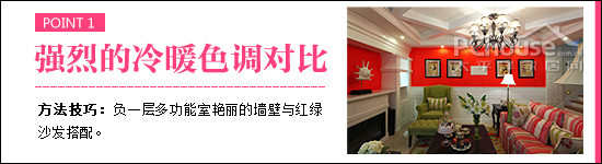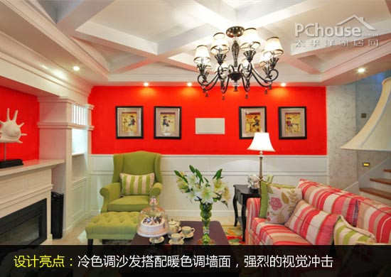 设计师解读:红绿色是常见的英伦风格色彩搭配,一冷一暖两种色调的对比下,刺激着眼球,同时也为空间带来活力,红绿当中混搭白色条纹缓和了视觉冲击力。布艺沙发材质带来轻松悠闲的氛围效果。