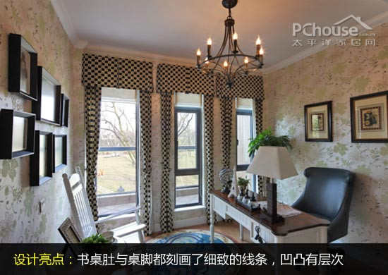 设计师解读:这是二层的书房,与三层悠闲区上下正对,拥有同样的采光优势。白色家具是这个空间的主调,为了突显英式风格,在桌脚与桌肚都做了线条处理,凹凸的层次,让肌理既简约又不失英伦风度。